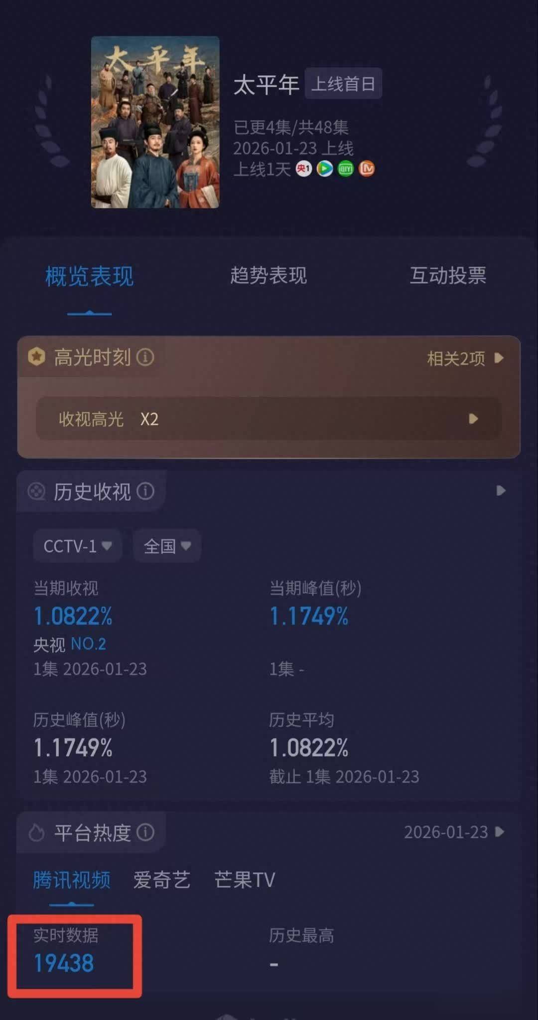 2026年1月23号晚上,央视一套黄金档,重大历史题材剧《太平年》首播了, 爱奇艺、芒果TV、腾讯视频同步上线,首播四集之后专业股票配资官网,全网热度很快就超过了19000,登上了各大热播榜单。